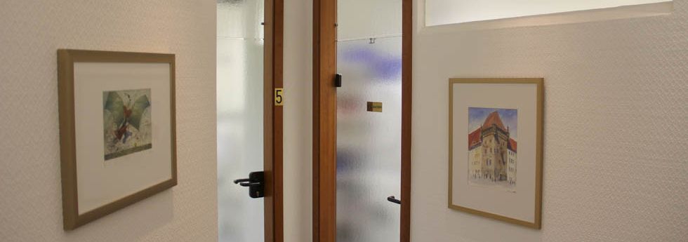 Die Praxis befindet sich im ersten Stock, ist jedoch dank Aufzug barrierefrei erreichbar.