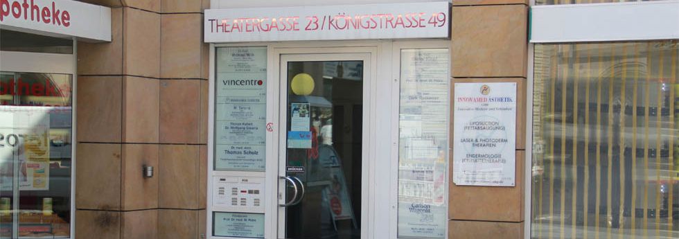 Den Eingang finden Sie, wenn Sie um das Gebäude herumgehen – er liegt direkt neben der Apotheke in der Theatergasse.